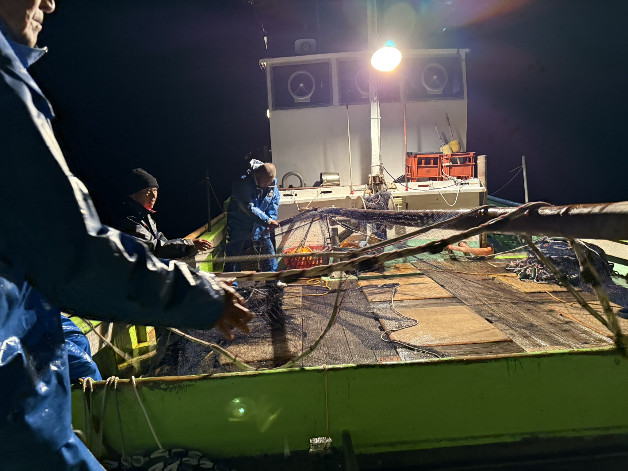 この日は深夜2時半ごろ、漁を終えて、野伏港に戻ってきました。拓恵丸を残して、一同は、トラックに道具をつんで小浜港に移動し、網をたたんで、いったん、解散しました。