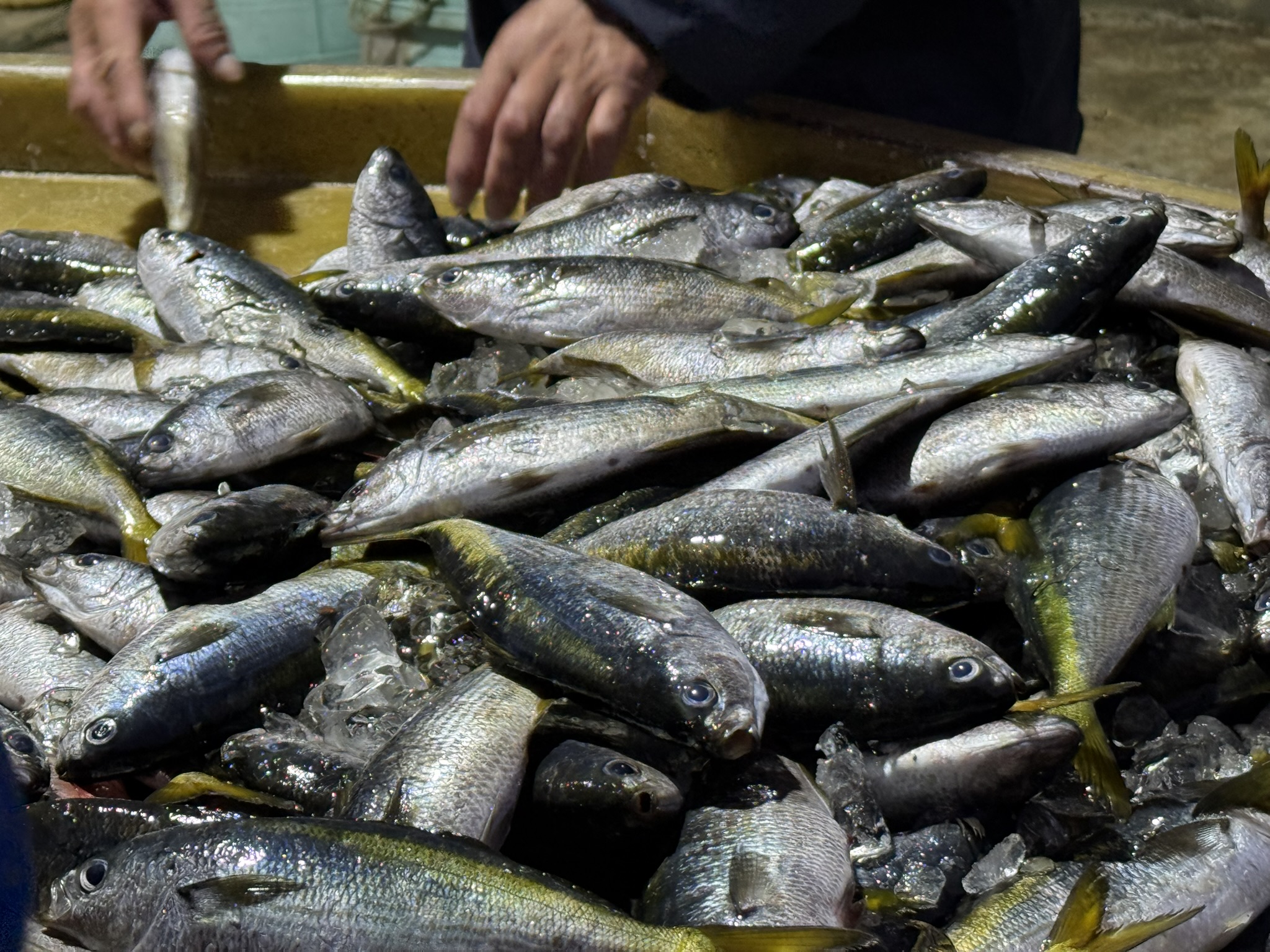 網から外したタカベを一カ所に集め、大量の氷とともに、船倉に冷蔵保管します。