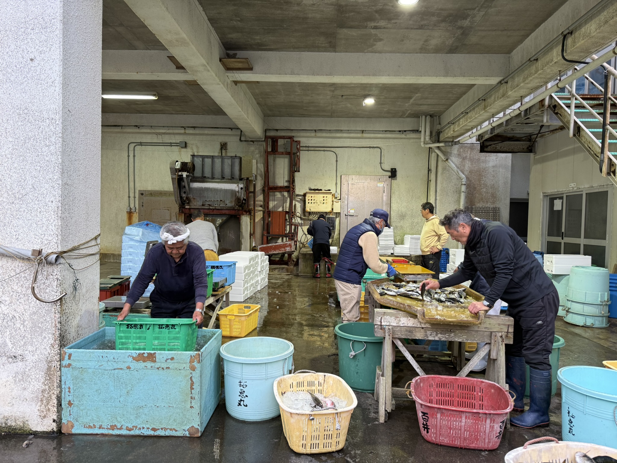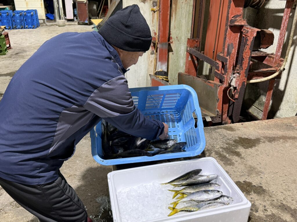 野伏港にある漁協に着いたら、それぞれの持ち場に散って水揚げの準備をします。