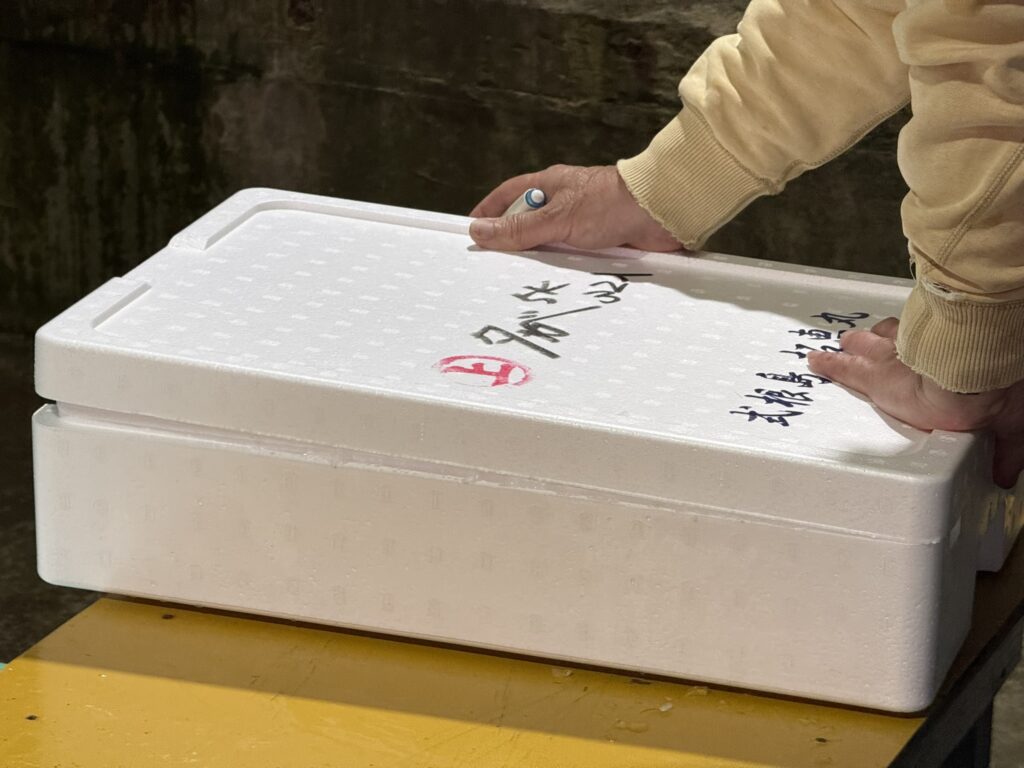 サイズ別に5kgずつに小分けして、発泡箱に氷詰めします。