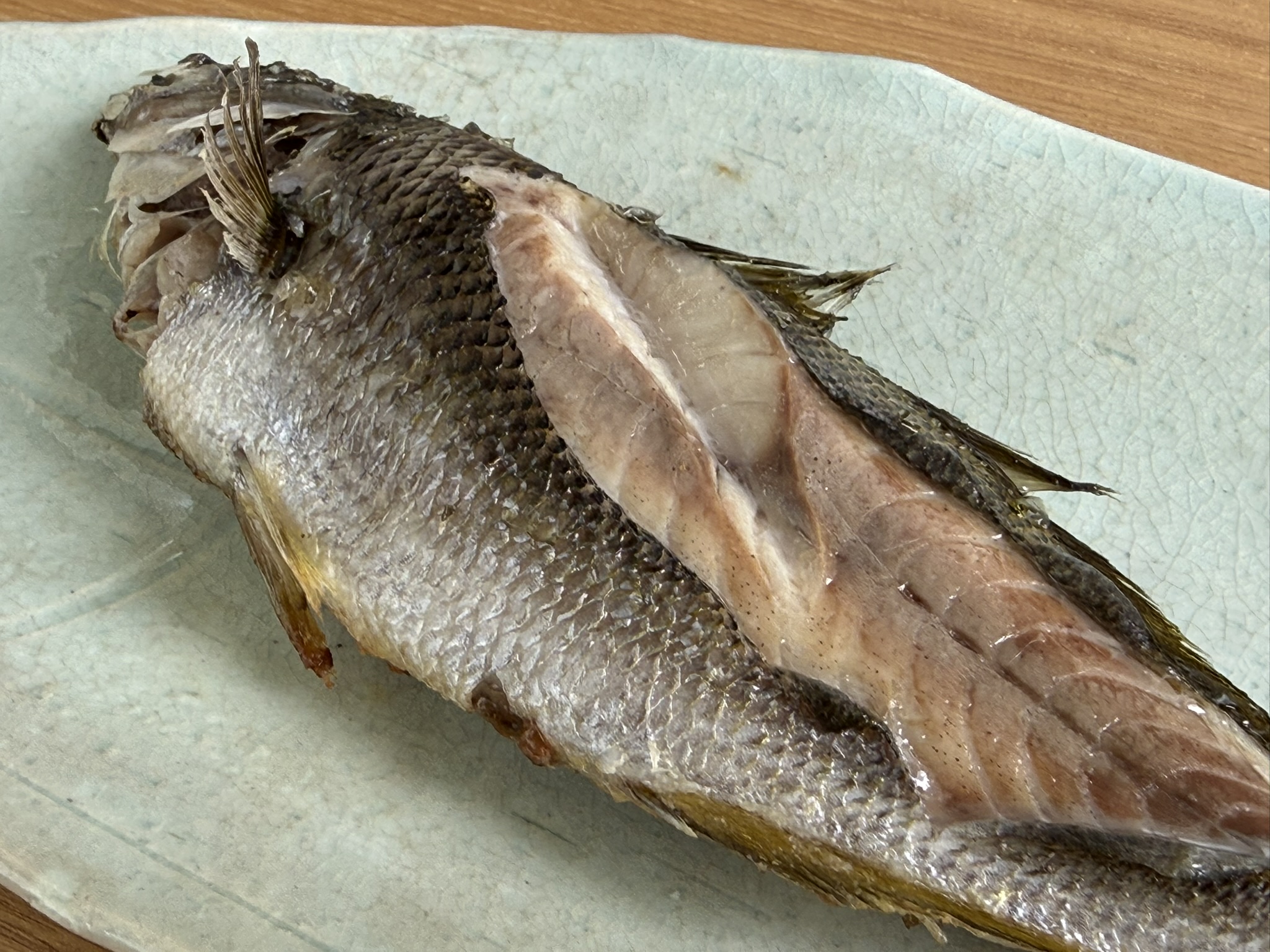 タカベは内臓の周りの脂肪に旨味があります。網漁でとったタカベはコマセや餌を食べていませんので、内臓を取らずに焼いて、にじみ出た脂に身をまぶしながら味わうのが格別です。