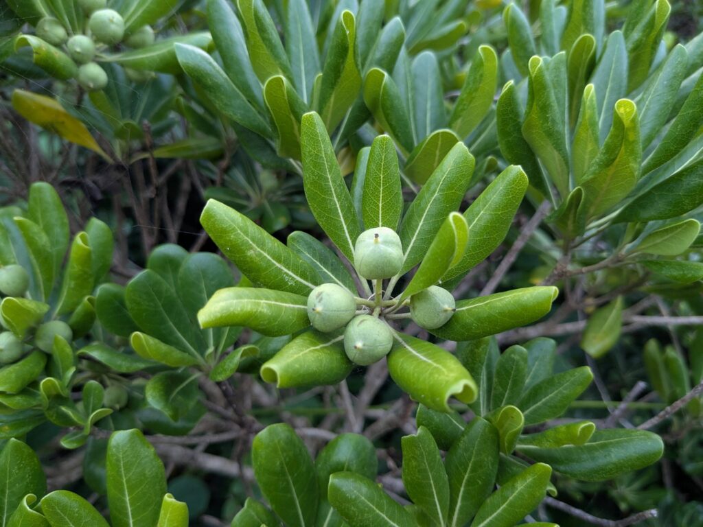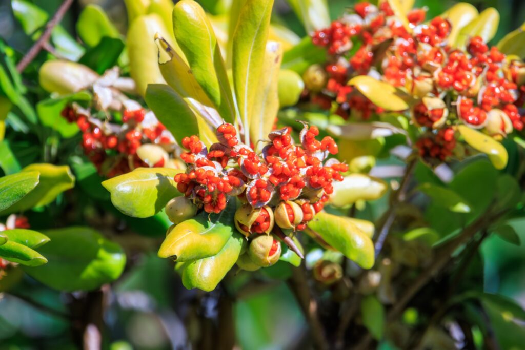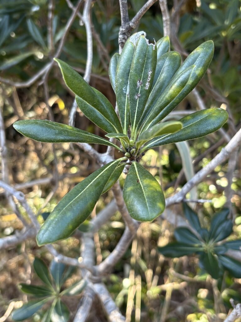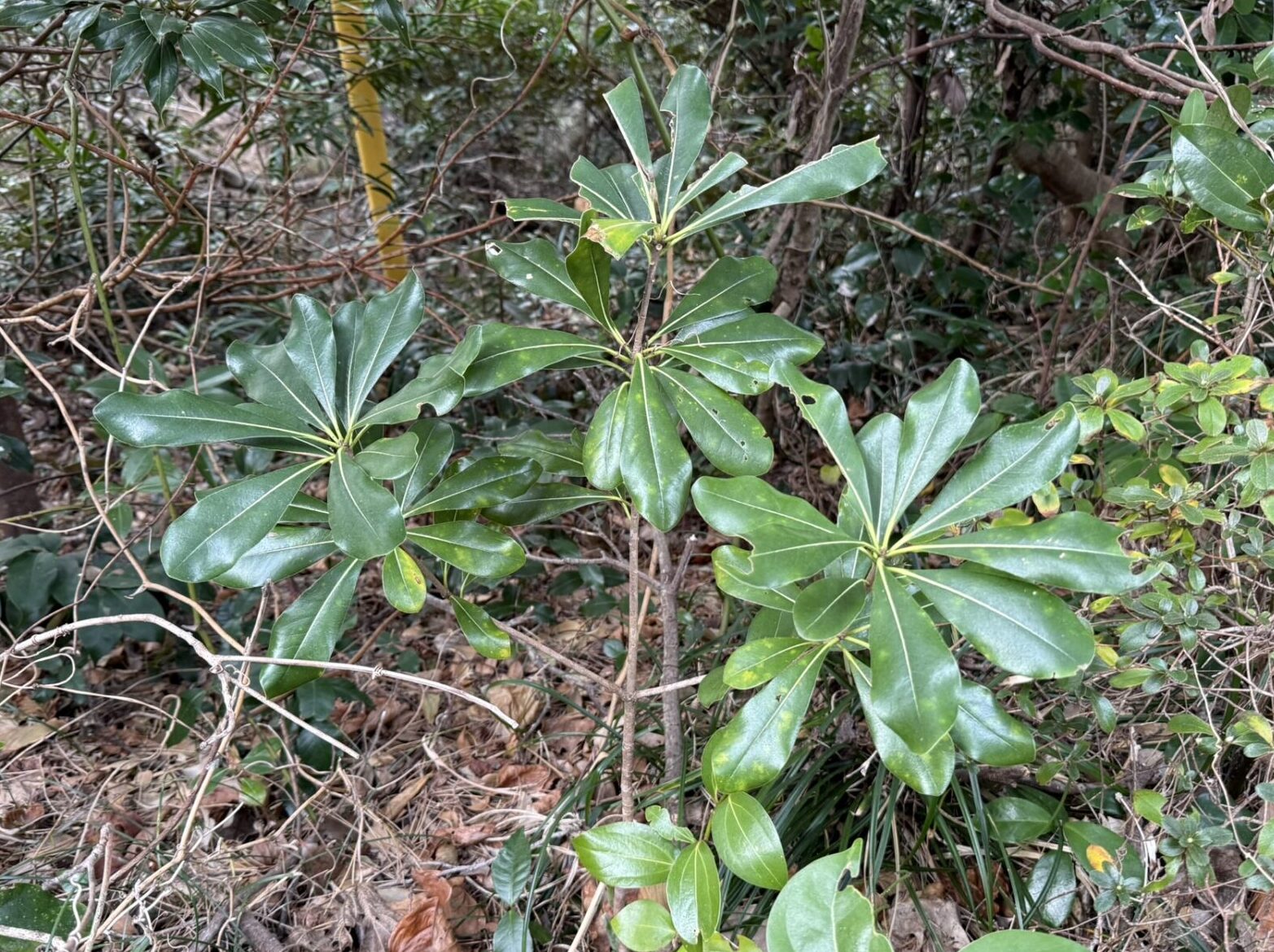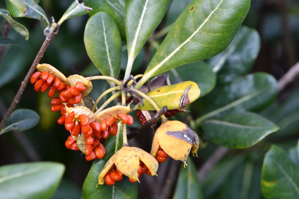 日本の東北地方以南の海岸付近に自生する常緑低木。厚く光沢のある葉で、潮風や乾燥に強い性質です。 5月頃には白から黄色へと色を変える清楚な花を咲かせ、甘い香りを漂わせます。秋には実が裂け、粘り気のある赤い種子を露出させる姿が観察されます。「トベラ」の名前の由来は、扉の木から転じたもので、魔除けとして、扉にはさむことから。式根島ではカンナンボウシの魔除けに使われます。