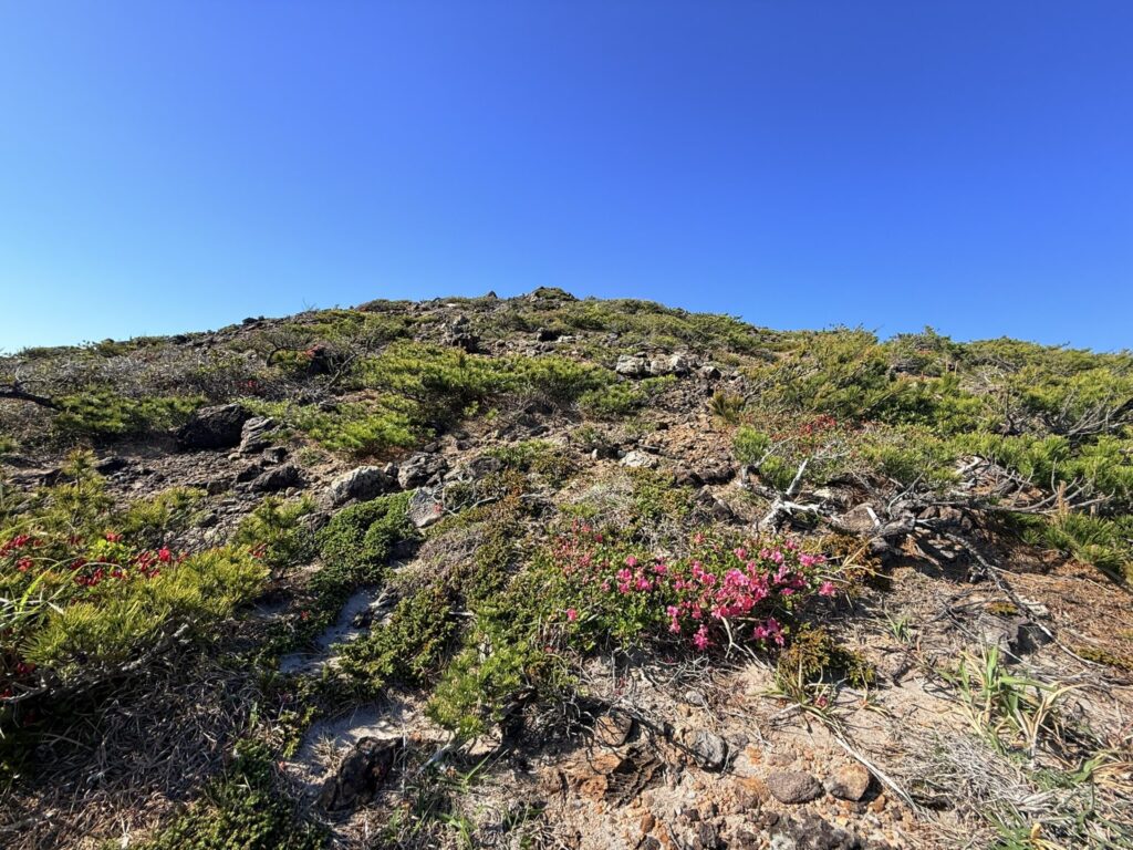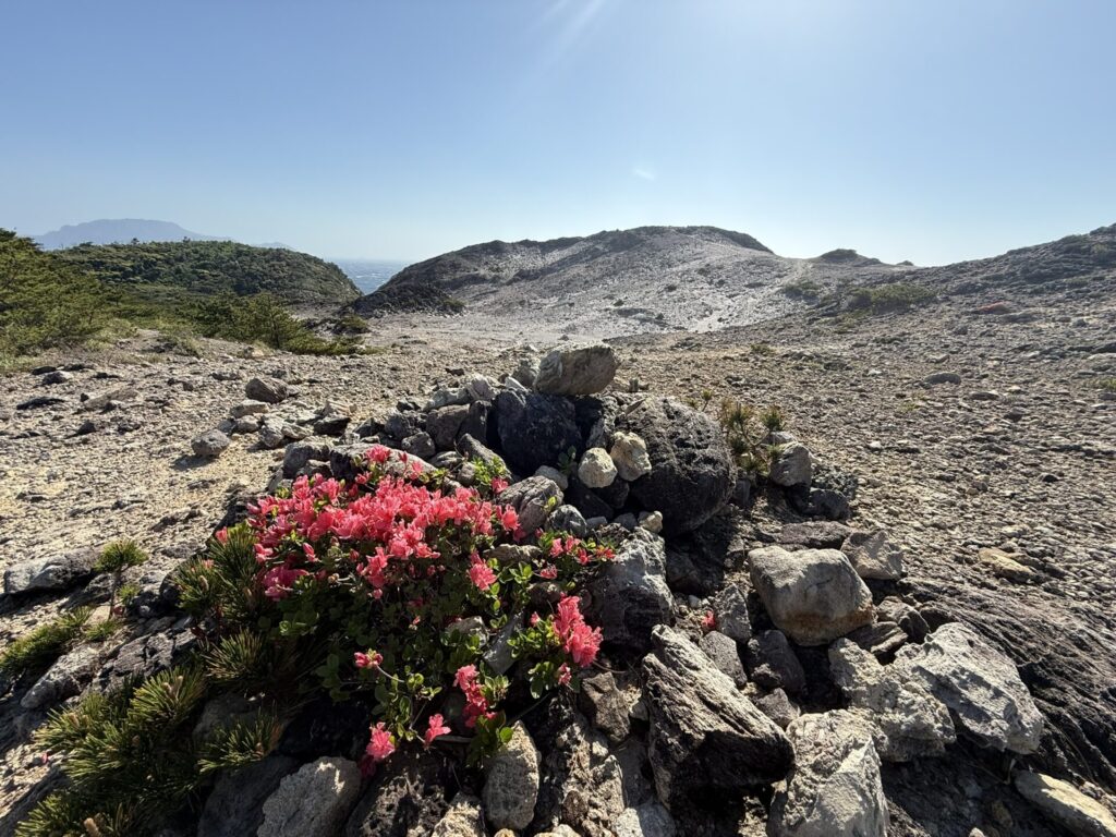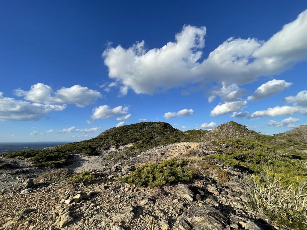 荒涼とした砂漠のような景観が特徴的な唐人津城(とうじんつしろ)は式根火山の古い火口の跡。津城とは昔の言葉で人や魚が集まる場所のこと。踏み跡が続くが、浮石の多い、崩れやすい断崖絶壁にあり、強風時は風速20m以上の風が巻いている。無理をせず、安全第一で行動を。なお、島の最高地点はそばにある佐々木山109mとなる。
