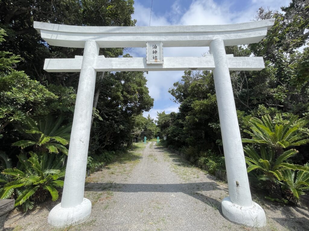 島の北部、泊浦に近い高台に鎮座する泊神社は1687年造営の歴史ある島内一の鎮守として、島民に親しまれている。御祭神は女性の神様で、伊豆七島の開祖神である事代主命(ことしろぬしのかみ)の后神、久爾都比畔命(くにつひめの)。