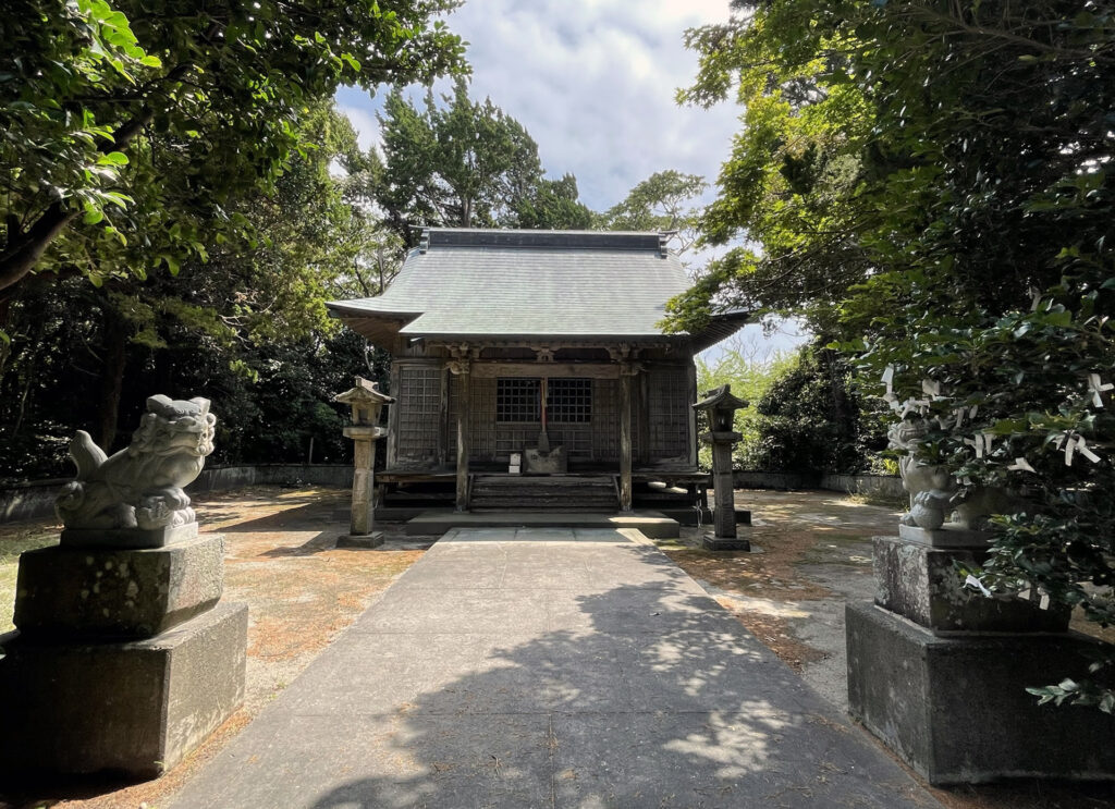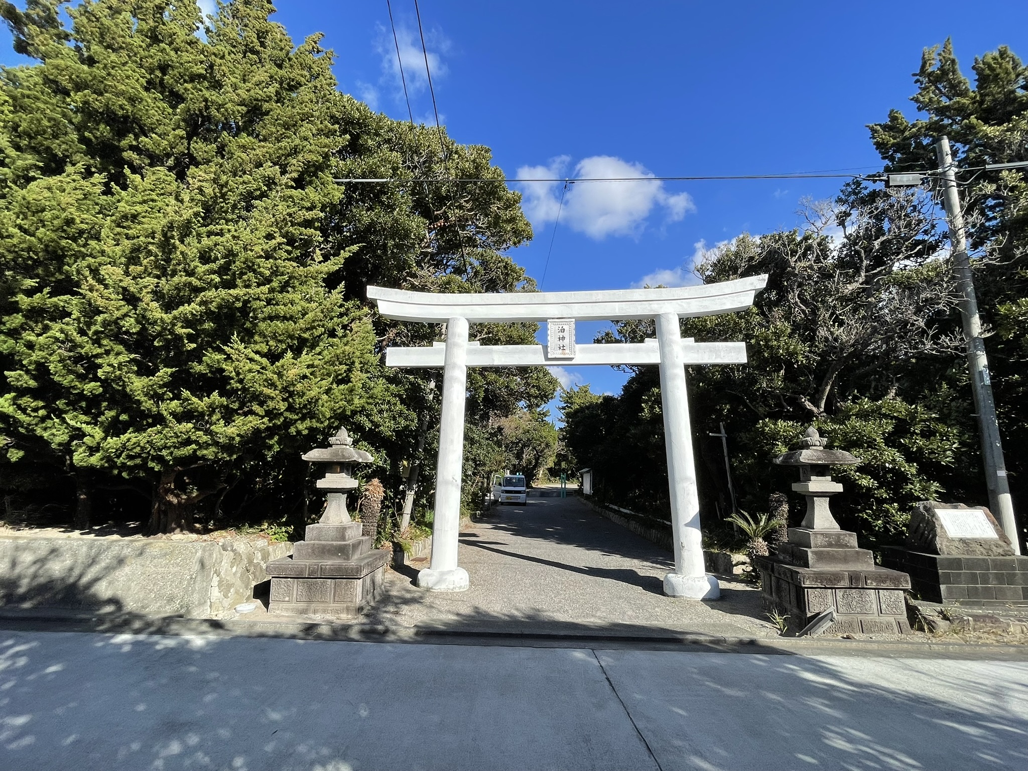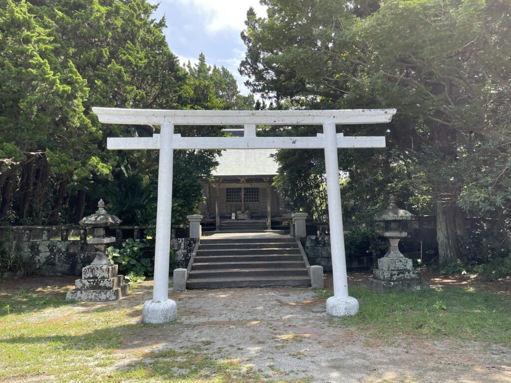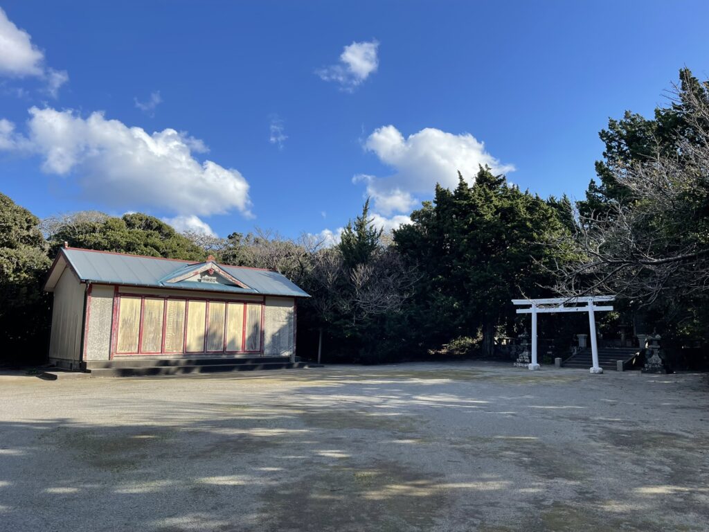 ひときわ目を引く、白い鳥居と白砂の境内が美しく、拝殿や神楽殿を擁す。例大祭は、毎年11月8日(前夜祭7日)に行われ、演芸の奉納をはじめ、出店もあり、島民が心待ちにする唯一の祭りとなっている。なお、御朱印やお守り等の販売はない。