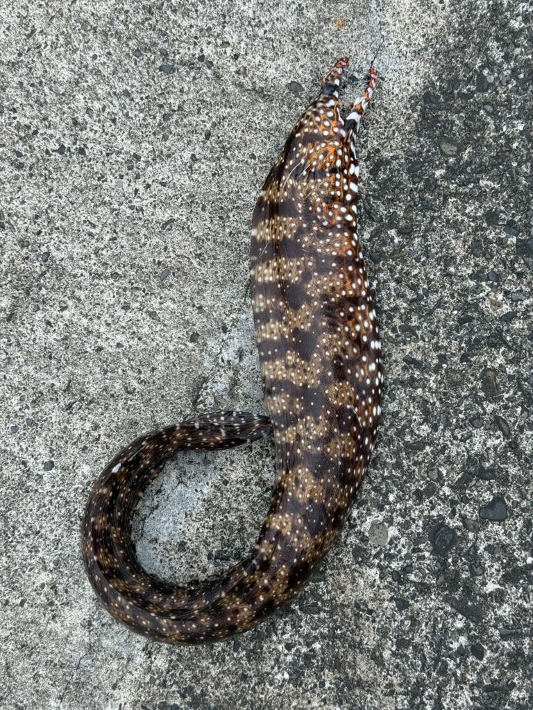 伊豆諸島のぶっこみ釣りでお約束の招かざる?ゲストがウツボの仲間。多いのは、普通のウツボとトラウツボで、ワカウツボやコケウツボはレア。トラウツボは通常のウツボより南方系でオレンジがかった赤茶色の肌に白い斑点が派手で大型。頭に生える角のようなものは、のびた鼻。ウツボ仲間共通のお約束として、歯が鋭く、力が強く、巻きついてくるなど厄介なので、釣れてしまった時は慎重に対応すること。肉を噛みちぎられるような大けがをしてしまうと、医療体制が脆弱な離島ではドクターヘリコースになってしまう。