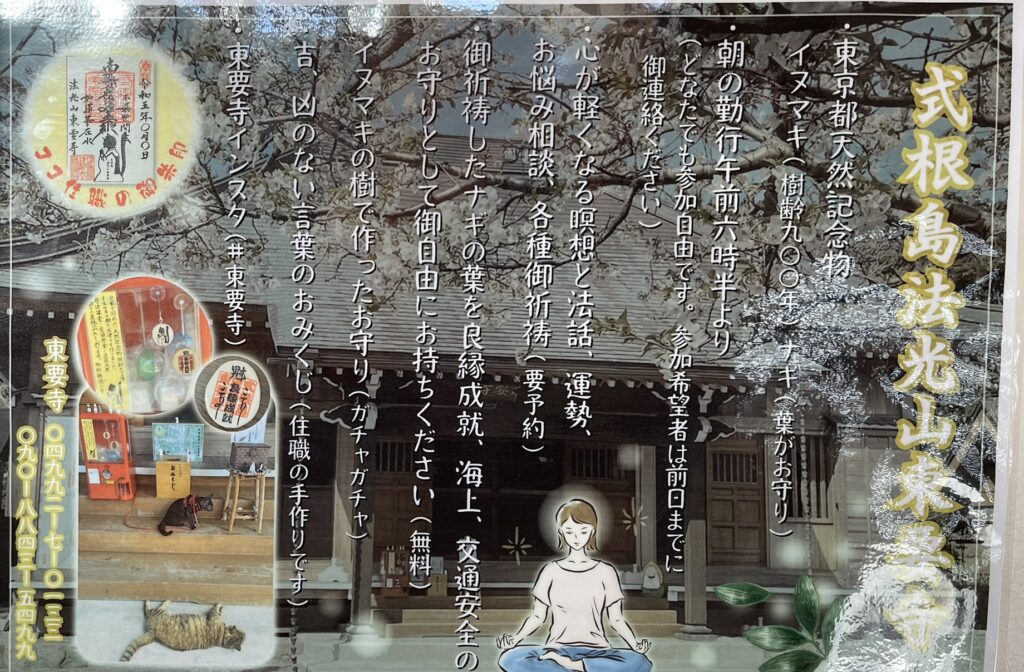 樹齢900年、高さ30m、幹周5mのイヌマキの巨木や梛(ナギ)の木の自生地があり、いずれも東京都の天然記念物に指定。東要寺では、夫婦円満祈願成就のお守りの縁起物「梛(ナギ)の葉」や、住職手書きの「言葉のおみくじ」「御朱印」などを用意する。”サーファー和尚”が温かく迎えてくれるので、気軽に立ち寄ってみてはいかが。