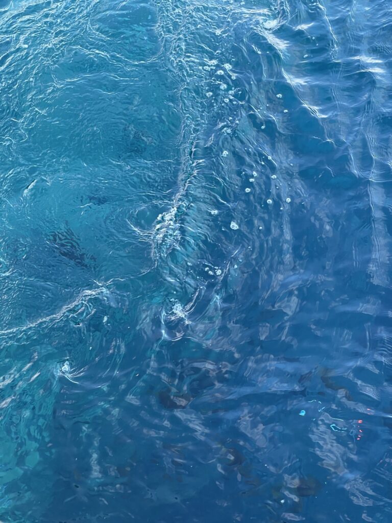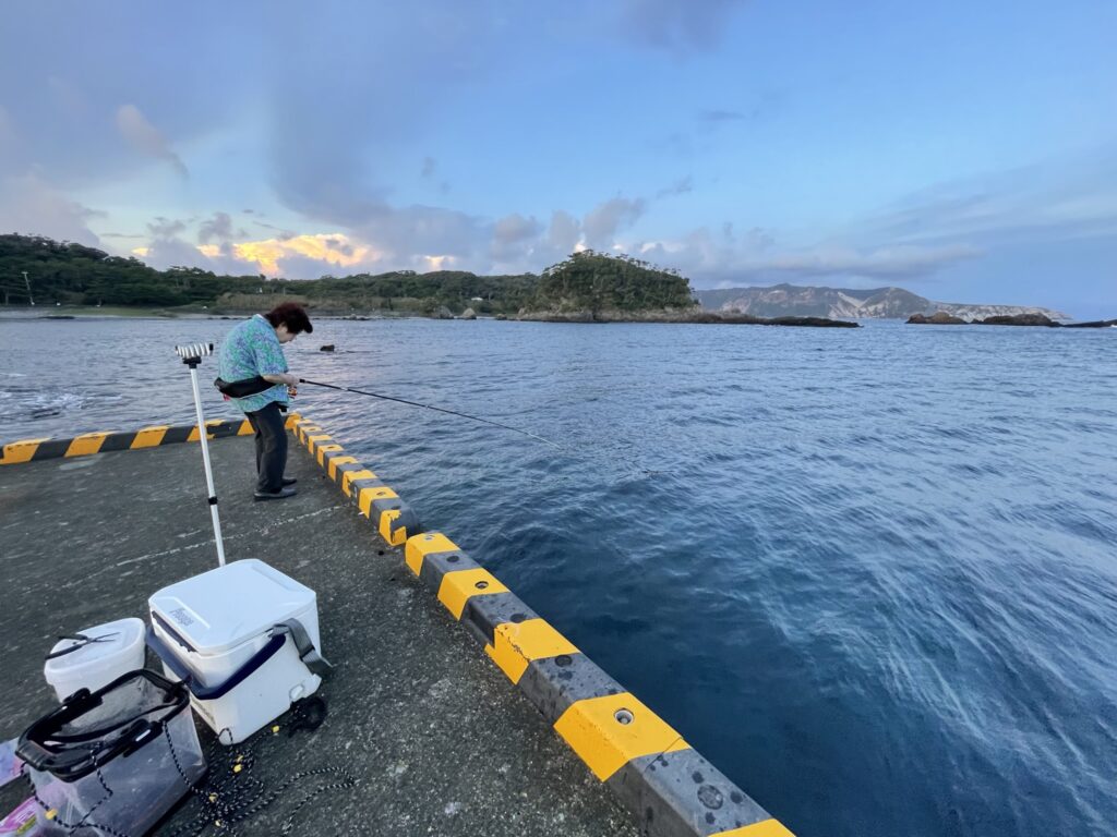 翌朝、私一人で6時過ぎから野伏桟橋に行くと、すでにたくさんの人が並んで竿を振っています。真ん中の空いているところに入って、糸を垂らしていると、突然、竿がぶっ飛びそうなほど引っ張られました。初めてのことに慌てて竿を振り回し、なんとか巻き上げようとしますが、ちゃっちいリールで四苦八苦。そばにいた島民の方が見かねて「あげてやるよ」と、糸をたぐってくれました(だいぶ情けない)。そして現れたのが、鮮やかな黄色の鯛のような魚でした。