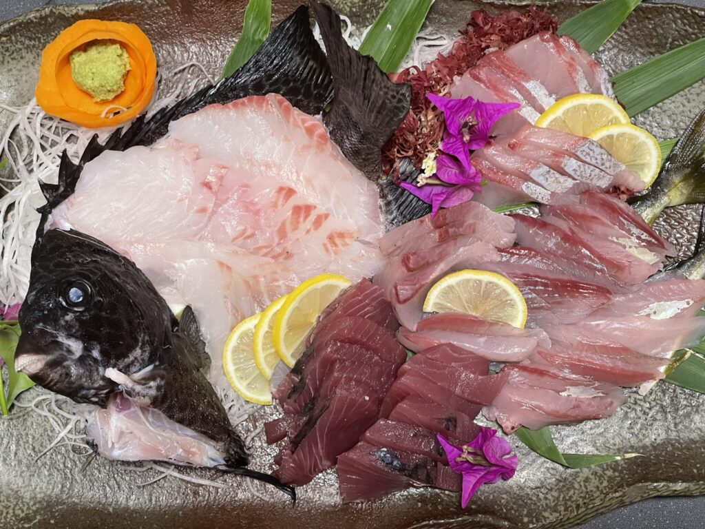 続いて、30cmはゆうに超えるアカハタをかけたものの、強い引きに驚いて、取り込み失敗。結局、ショゴ2匹の釣果となり、頼んでおいた刺身に盛り合わせてもらいました。ちなみに、この時、その後、私のメインターゲットとなった「イシガキダイ」との運命の出会いを果たしました。何だこの魚・・筋肉質でうまい!うまいぞ!