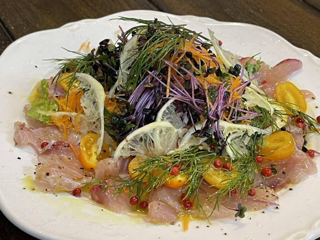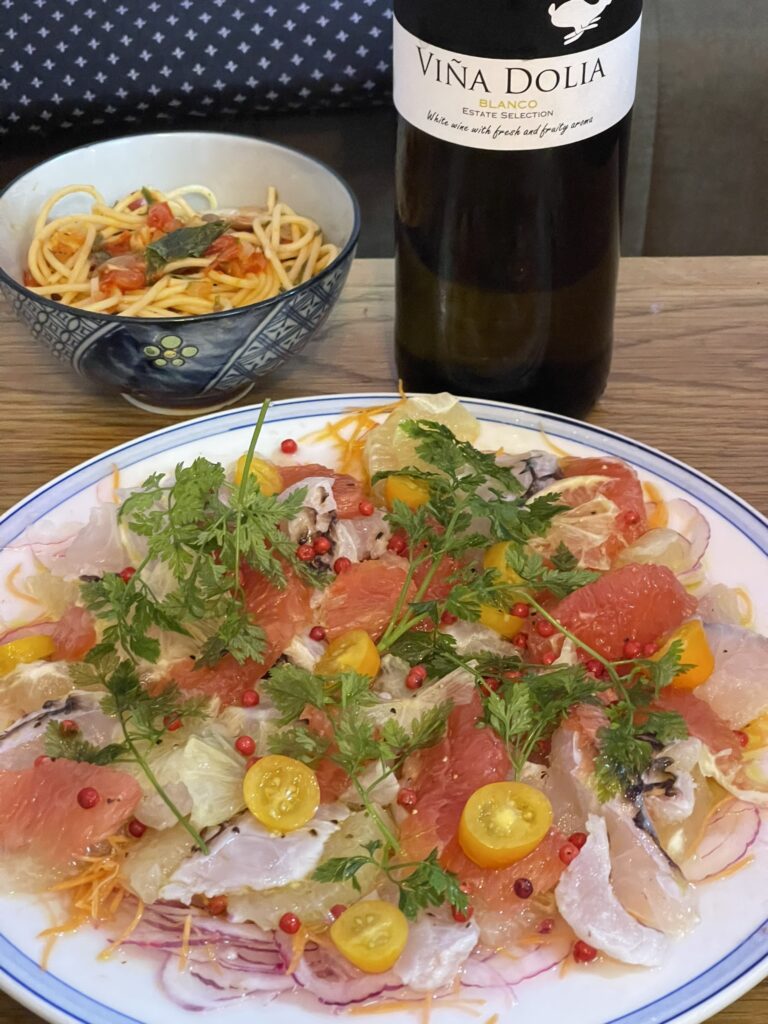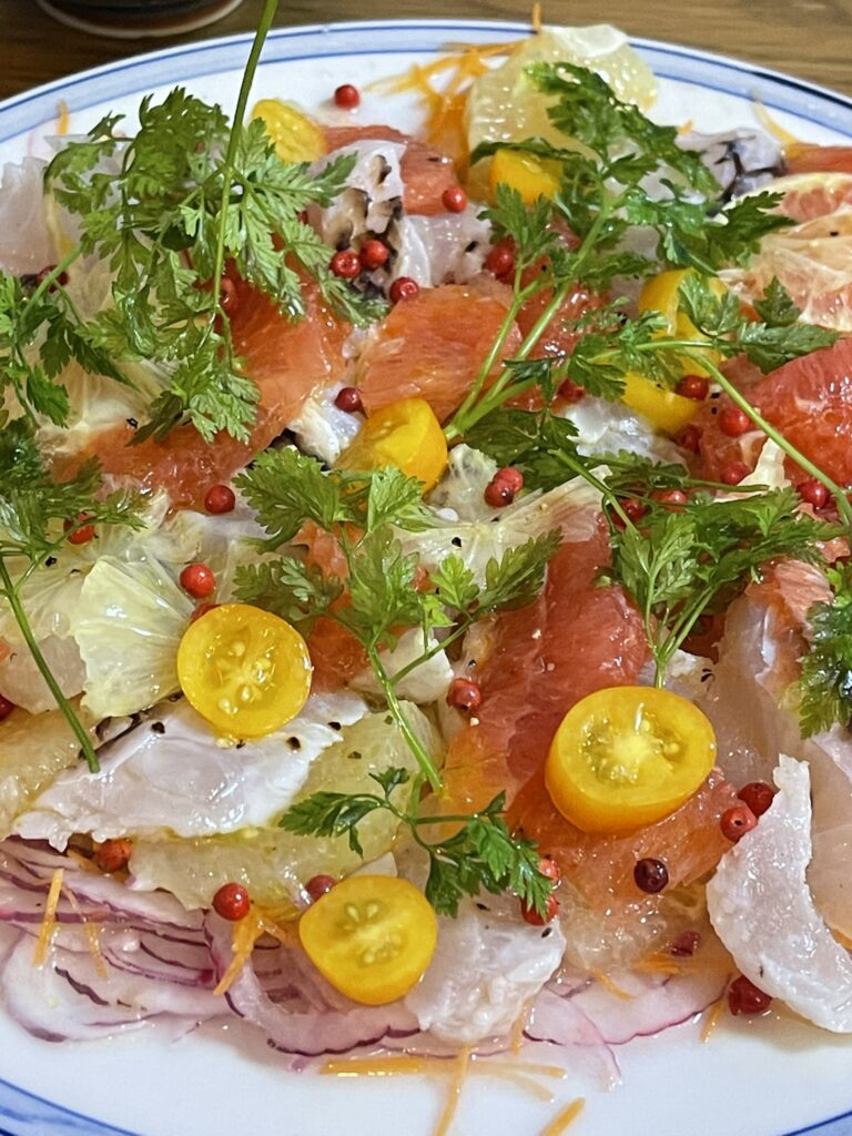 カルパッチョの色彩は「白、黄色、緑の爽やか系」「紫やオレンジのハロウィンカラー」「赤・黄色・緑と、とにかくカラフルに」など、その時によって変わりますが、実際は切って並べるだけの簡単さ。それでいて、とにかくバエるので、気持ちも楽しくなりますし、何より、釣りたての新鮮な魚が美味しく、私にとって最高の御馳走です。私はこの美しいカルパッチョをいつの間にか、冗談めかして「バエパッチョ」と呼ぶようになりました。