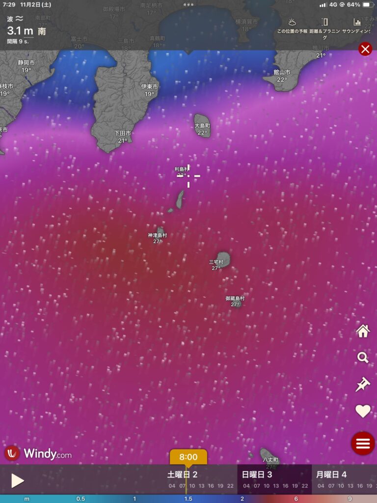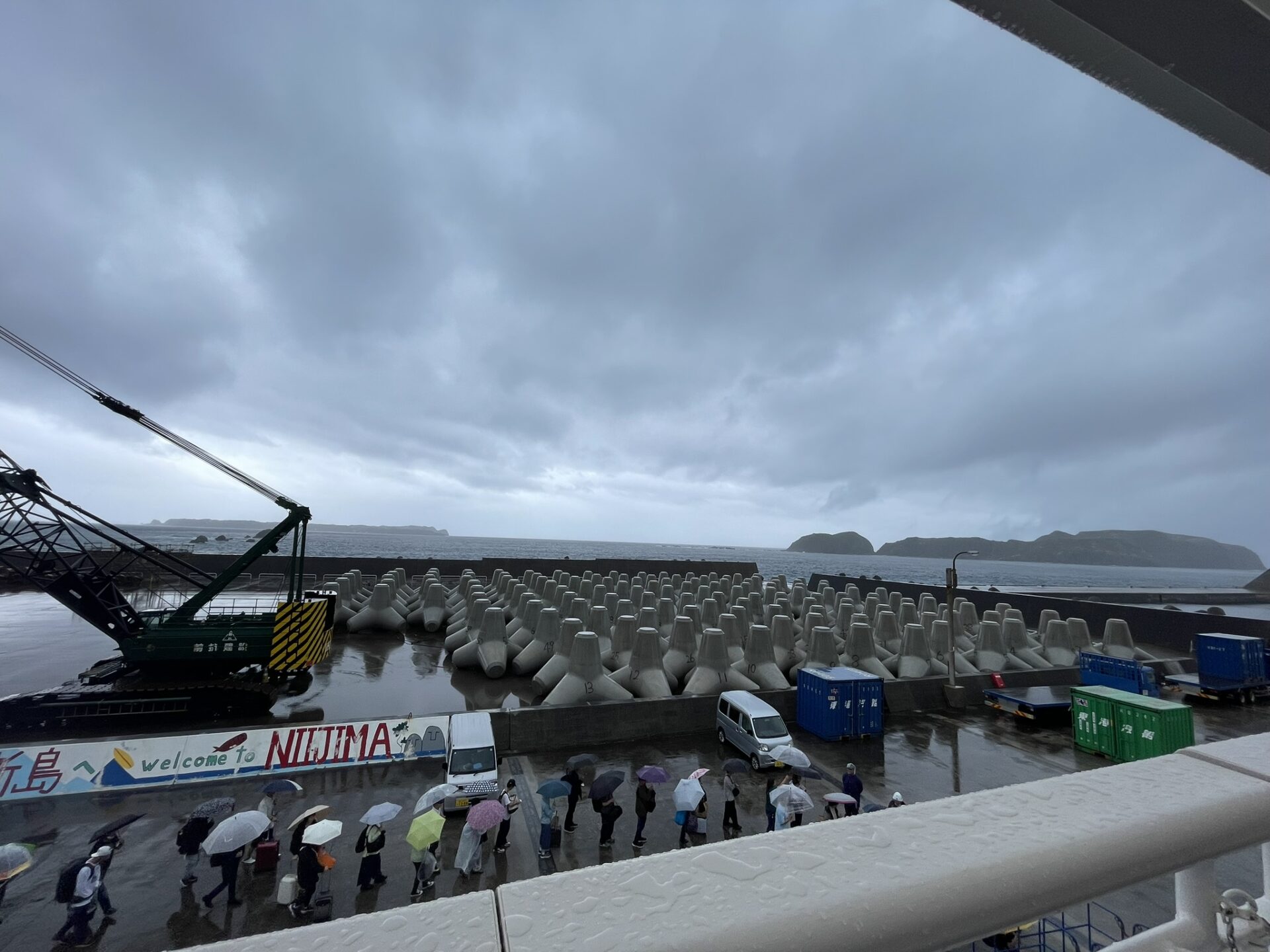 時化のなか、さるびあ丸はなんとか式根島に着岸することができました。