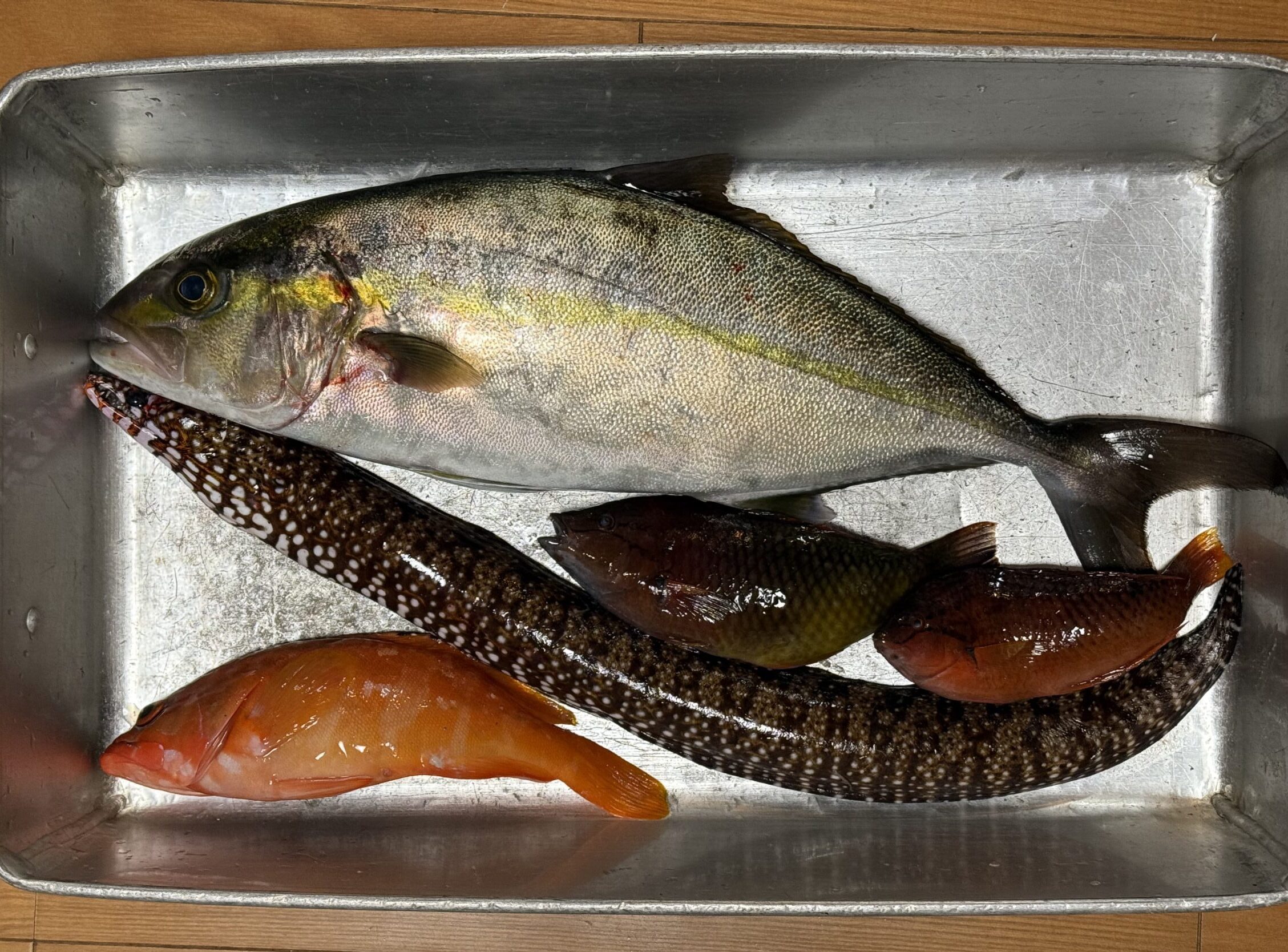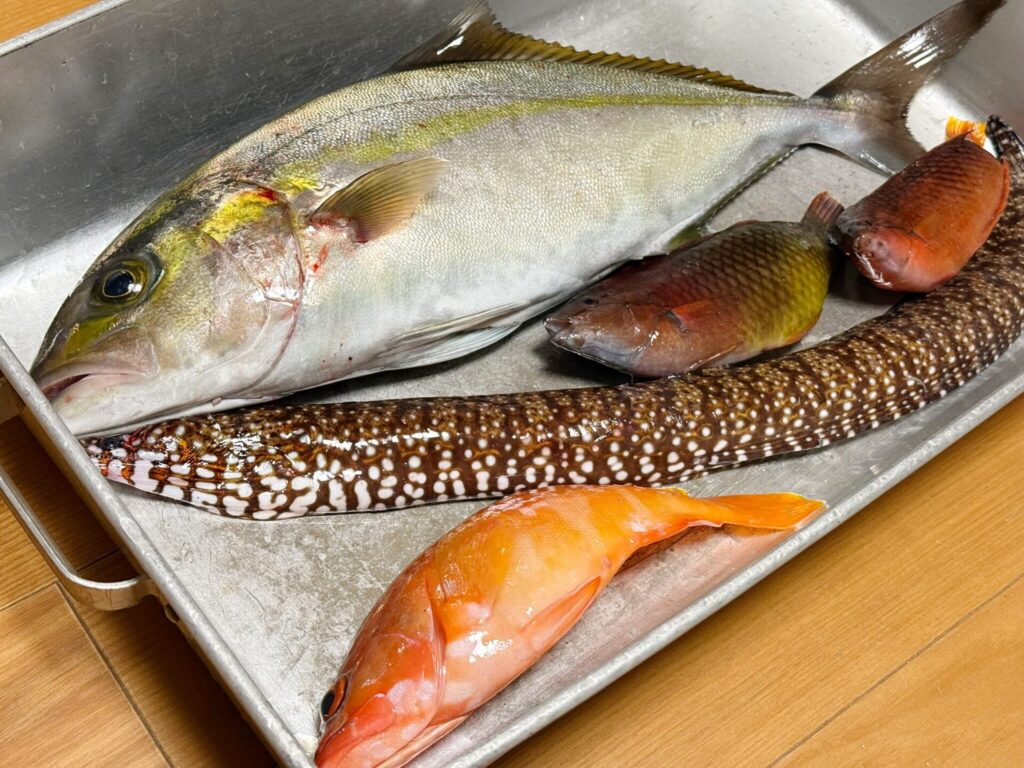 そして、いつもはうんざりするほど釣れるウツボも、狙ったとたん、なかなか獲れないわけです。それでも小さなトラウツボをなんとか1匹ゲット。蒸し魚用はアカハタとベラが合計3匹。こんなところでいいでしょう。