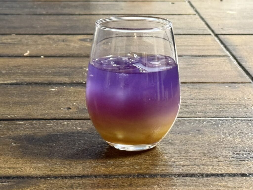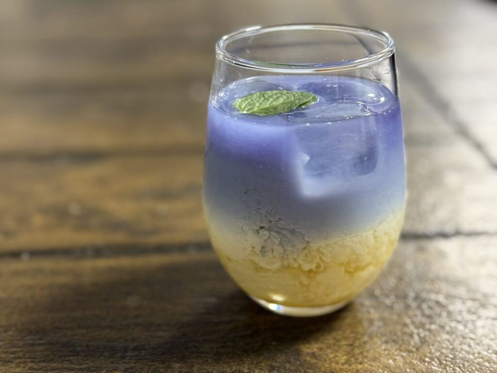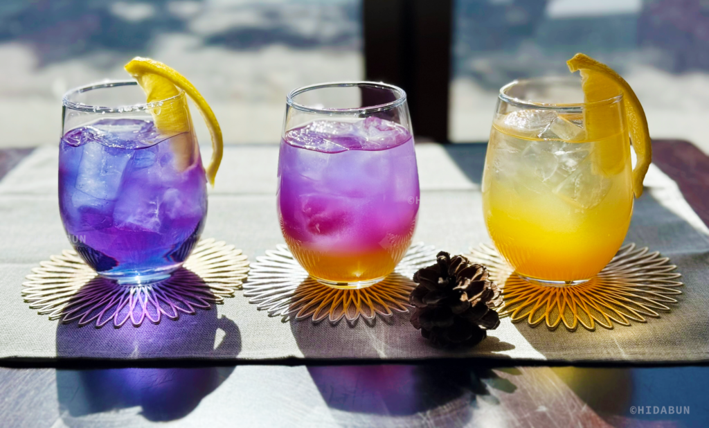 一番、苦戦したのは、太陽が夜の底を明るく照らす、夜と朝のあいだを表現するカクテルです。朝はオレンジ色、夜はバタフライピーの深い青、その間をつなぐのが問題です。中間に牛乳を注いだら大失敗。