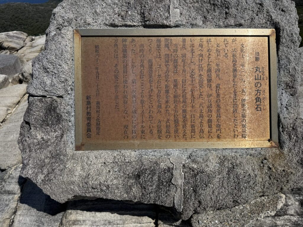 神引展望台といえば、伊能忠敬の測量チームが来島した際に置いたと言われる丸山の方角石で知られています。伊能忠敬測量研究で知られる佐藤先生の式根島における当時の測量のお見立てなどを聞きながら、みんなで学び深いひと時を過ごすことができました。