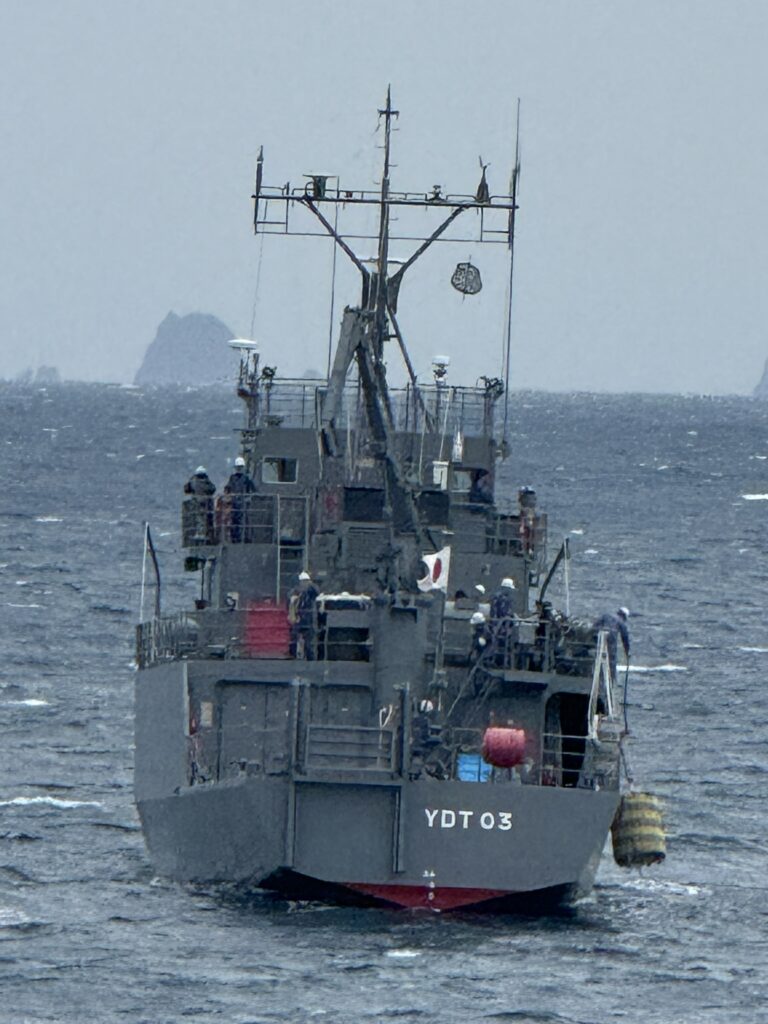 帰りのさるびあ丸から見た海上自衛隊の水中処分母船。危険な水中処分隊(機雷や不発弾、水中の爆発物処理など、危険な潜水作業を行う水中処分員の部隊)の支援を行う母船だそうです。働く船との出会いも、船旅の醍醐味です。