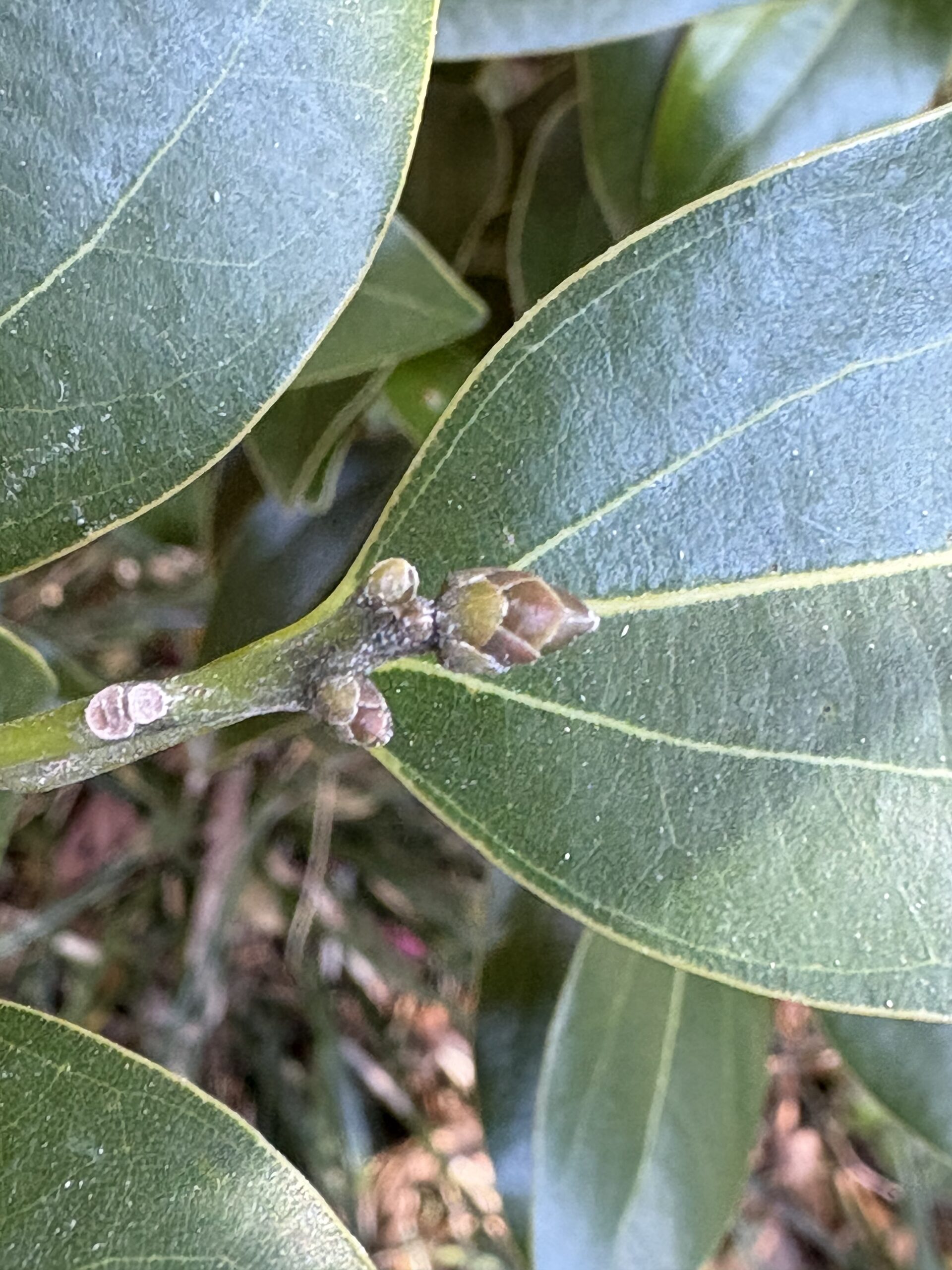 常緑広葉樹。皮のようにじょうぶな葉は卵形で先端がとがる。表側は濃い緑でつやがあり、裏側は黄緑色でつやがない。3本の葉脈が目立つ。葉をちぎるとシナモンの香りがする。小さな黄緑色の花が6月に咲く
